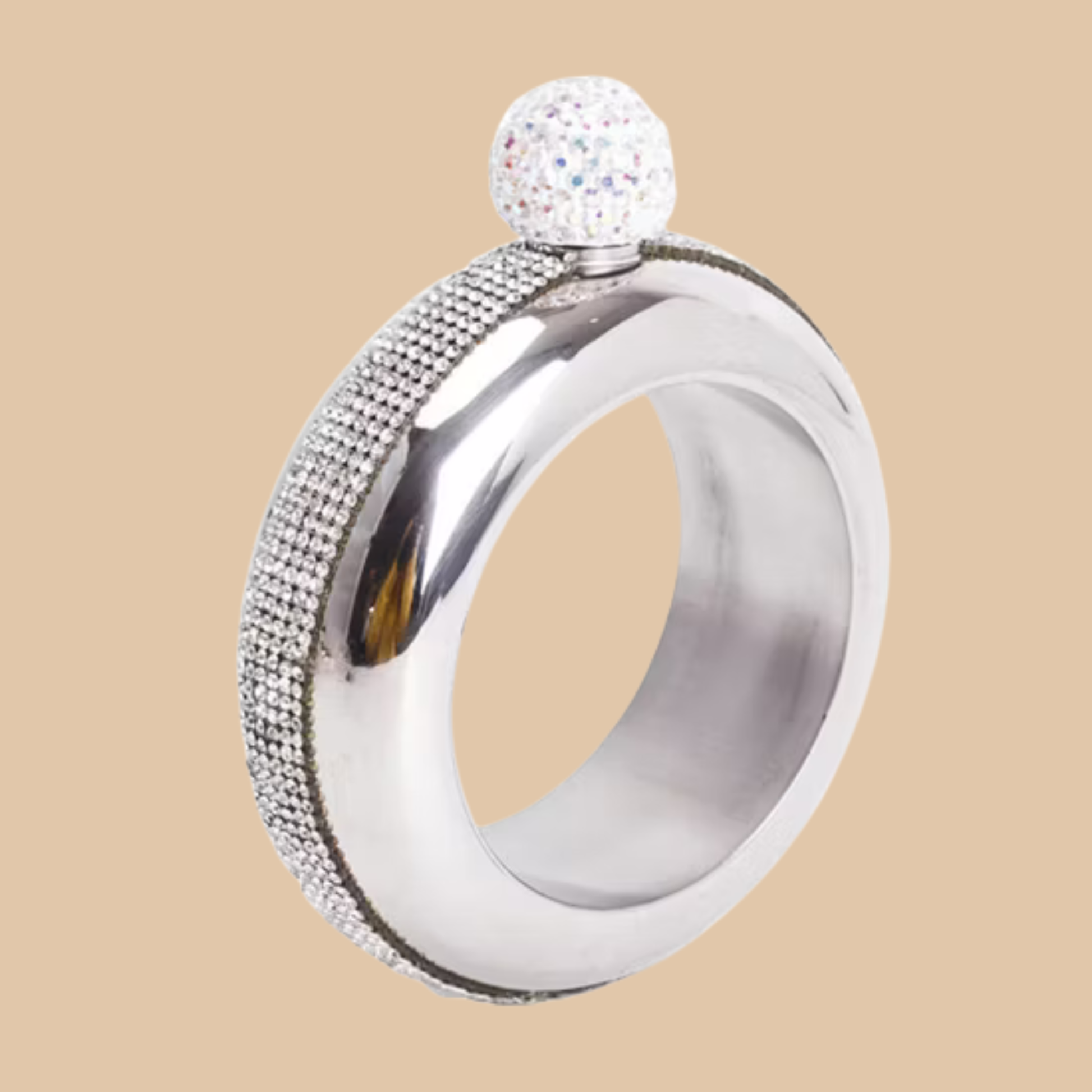 This flask bracelet combines jewelry style with discreet functionality. Made from stainless steel and accented with rhinestones, it features a hidden flask compartment with lid and funnel. Designed for parties, festivals, and events, it allows portable beverage storage while maintaining an elegant bangle appearance. Durable and eye-catching, it offers both fashion and novelty appeal.