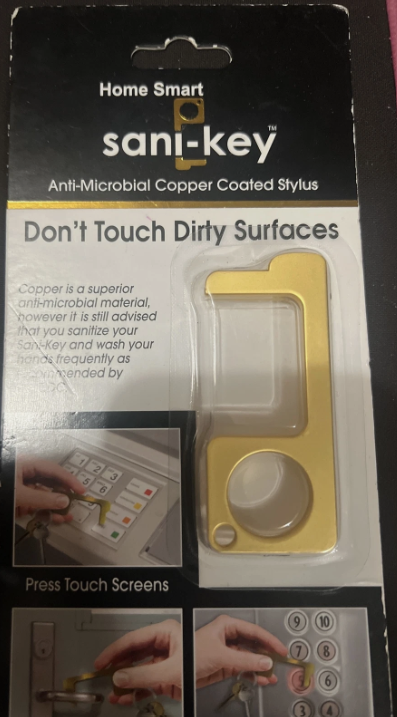 Avoid germs and stay protected with the Home Smart SANI-KEY, a compact no-touch tool designed for hands-free interaction with public surfaces. Coated in gold-tone antimicrobial copper, the SANI-KEY allows you to press buttons, open doors, and navigate touchscreens without using your hands. Its stylus tip ensures compatibility with ATMs, kiosks, and elevators, while the keychain-ready design makes it easy to carry on your bag or belt loop. Though copper naturally resists microbes, regular cleaning is recommended to maintain hygiene. Lightweight, reusable, and ideal for everyday errands or travel, the SANI-KEY is your smart solution for staying clean in shared spaces.