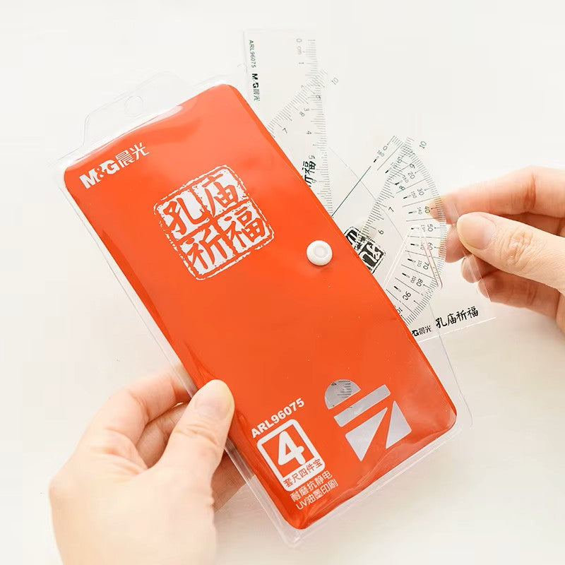 The M&G ARL96075 4-Piece Ruler Set is a versatile stationery essential for students and professionals alike. This set includes a ruler, set square, protractor, and exam ruler—perfect for precise measurements, geometry work, and technical drawings. Made with durable, clear plastic for accuracy and easy visibility, it comes in a compact red case for convenient storage and portability.