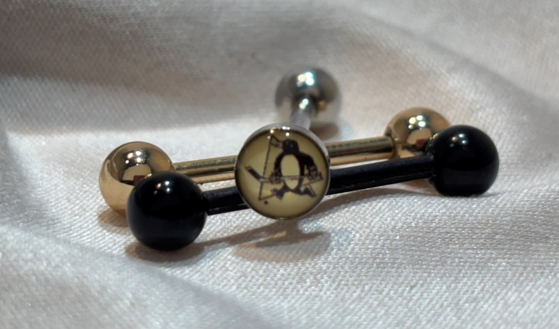 Rep the Pittsburgh Penguins with this titanium tongue ring featuring the team’s bold 3D logo. Designed for durability and comfort, this barbell is a stylish way for fans to carry their team spirit wherever they go, adding an edgy hockey-inspired touch to any look.