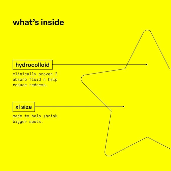 A pack of 32 hydrocolloid pimple protectors in an extra-large size. These 20mm-wide Hydro-Stars are perfect for helping shrink bigger spots. Hydro-Stars are made with 100% hydrocolloid, a material that’s clinically proven to absorb fluid and help reduce redness to shrink spots overnight. Perfectly shaped to grip the contours of the face, Hydro-Stars are designed to really stick. They shield spots from outside bacteria and serve as a gentle reminder to avoid skin picking. Quantity: 32 stars Great as a stocking stuffer or gift!